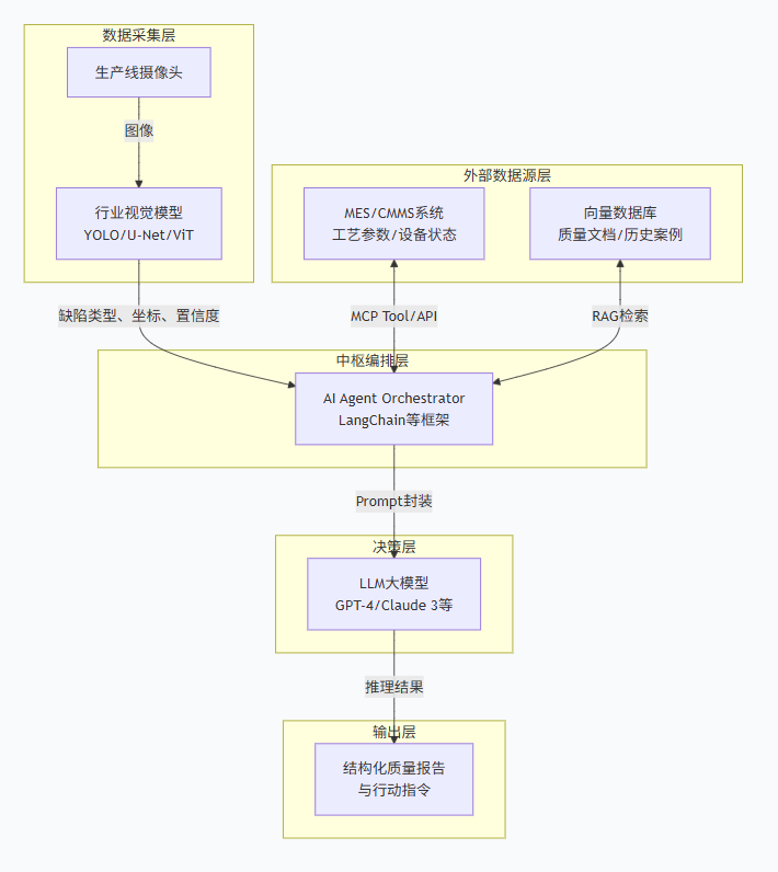 摄像头拍下产品 → 视觉模型找出缺陷 → Agent调取工艺参数和知识库 → 大模型分析根因 → 输出质检报告与处置指令。整个过程实现了从“看见”到“理解”再到“建议”的智能化闭环。