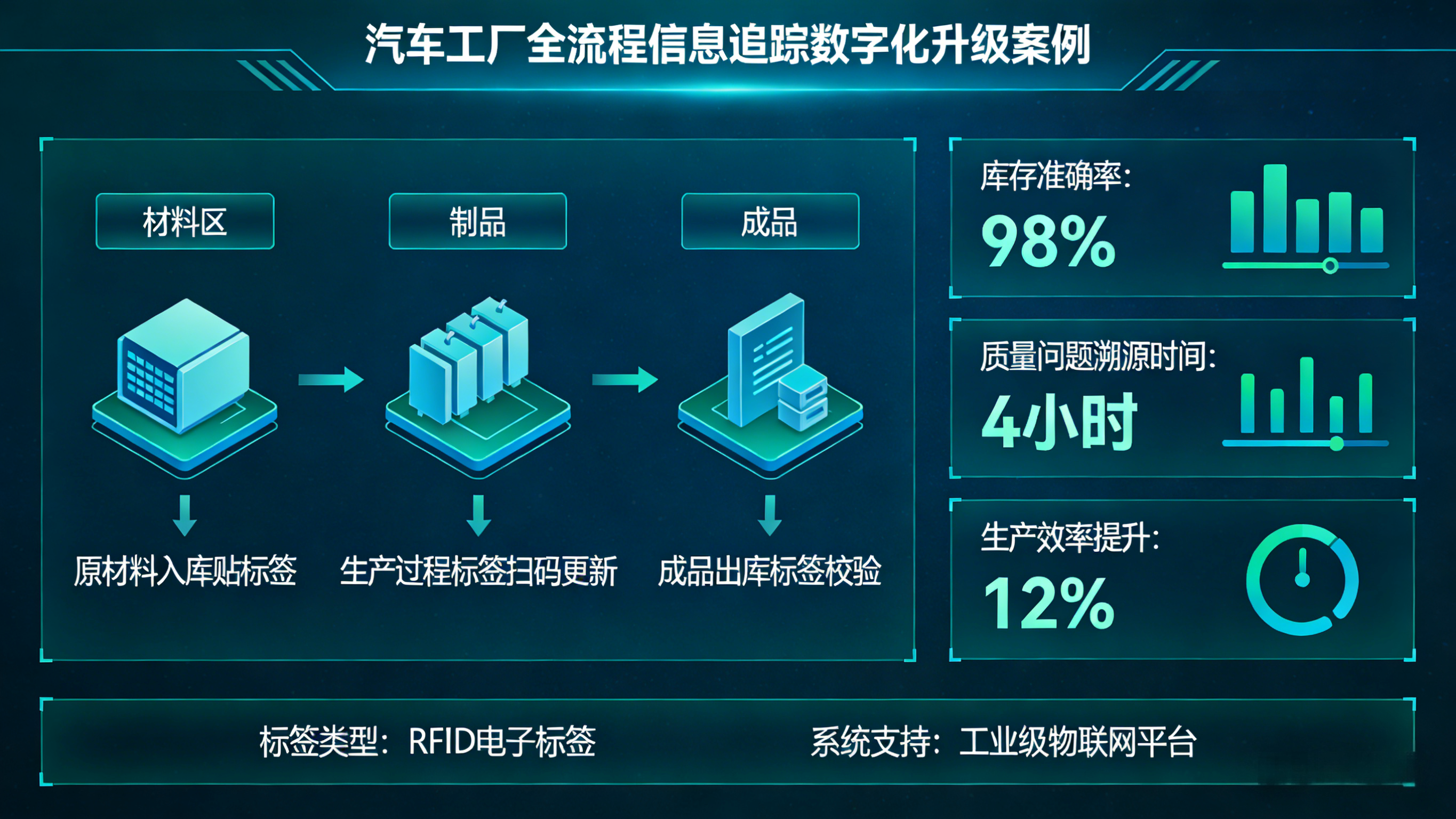 一家汽车工厂如何用小小的标签,打通原材料、在制品到成品的全流程信息追踪?从库存准确率飙升至98%,到质量问题溯源从48小时缩至4小时,本文拆解了一套让生产效率提升12%的数字化升级实战案例